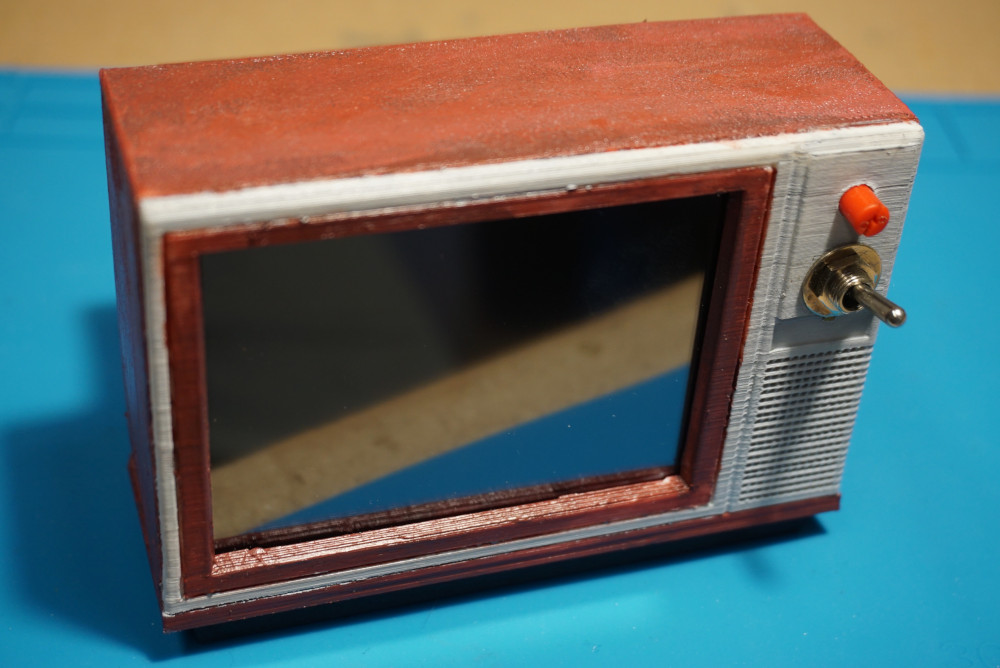To make it look more like the real thing, some color was needed. I used acrylic to paint the outer surface of the TV, trying to mimic woodgrain and plastic colors as well as possible. To avoid accidentally mixing colors i used masking tape to cover parts that I did not want painted.
